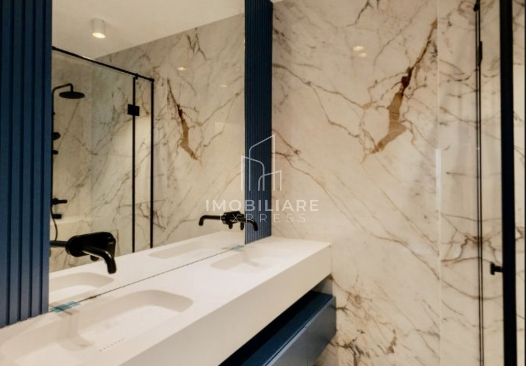 🛁 Băile sunt amenajate într-un stil modern, cu placări ceramice tip marmură, cabină de duș walk-in și mobilier elegant, oferind un ambient sofisticat și confortabil.
