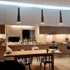 Parterul se deschide într-un living amplu și luminos, conectat natural cu grădina. Bucătăria, echipată integral cu electrocasnice premium Bosch/Siemens, este completată de un dining elegant, ideal pentru momentele în familie. La acest nivel se regăsesc o zonă de intrare spațioasă, o cameră tehnică, un grup sanitar, precum și un garaj încălzit de 18,6 mp, un adevărat avantaj în segmentul rezidențial.
